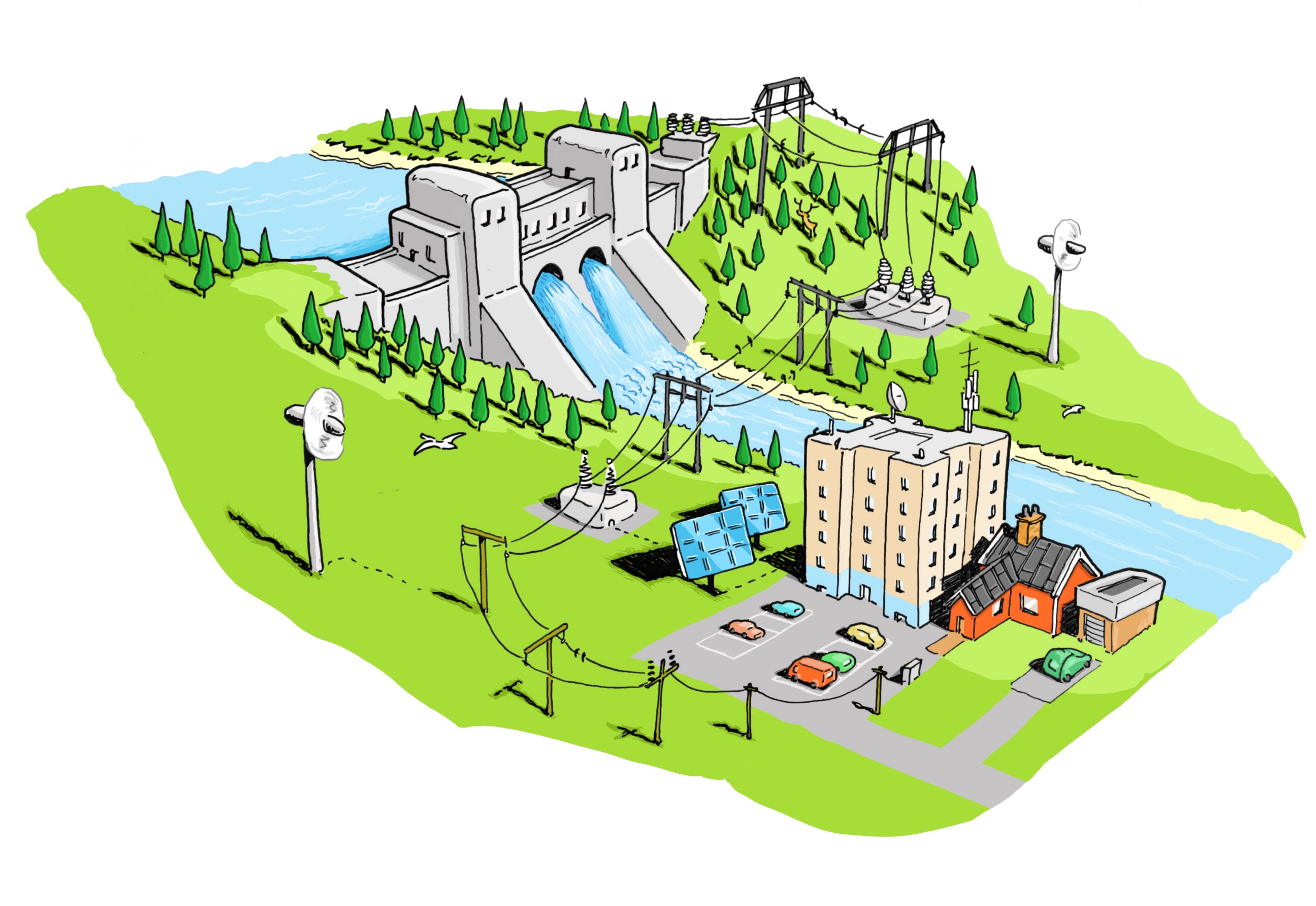 Här beskriver vi hur det svenska elnätet är uppbyggt och hur elen transporteras till våra hus och företag.